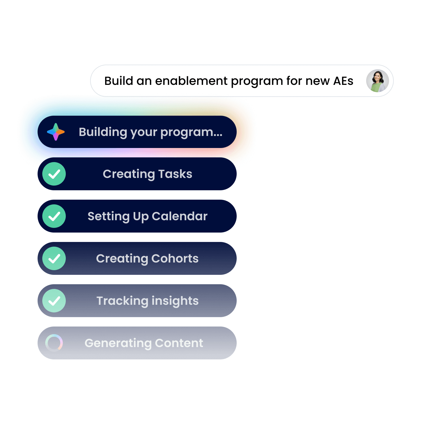 Generate programs, enroll reps, manage cohorts, and track impact automatically — freeing your team to focus on strategy instead of coordination.